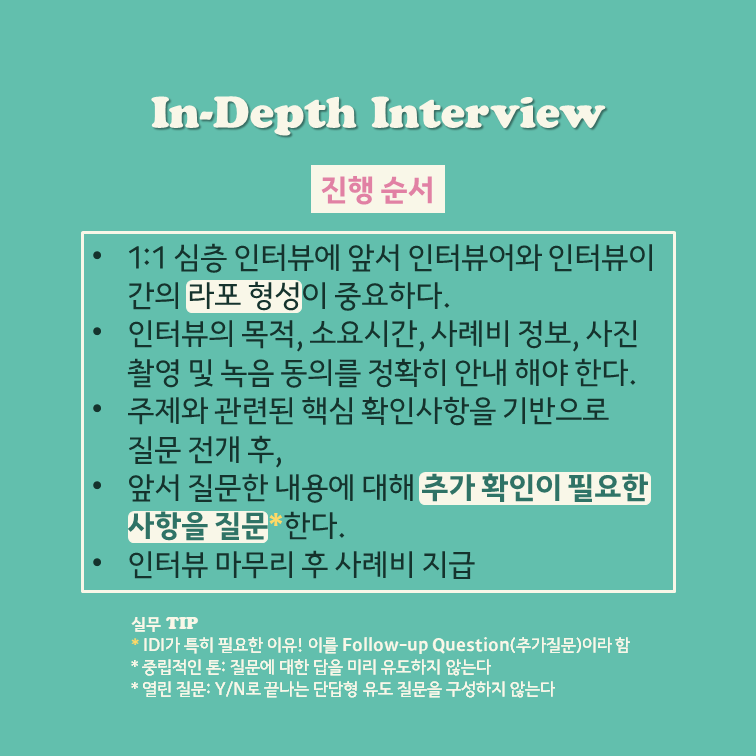 인터뷰와 서베이의 뉘앙스 차이도 발견했다! FGI, IDI, Surveys 모두 다른 영역이라는 점 히히
