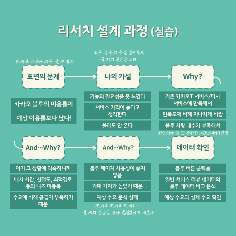 문제 딥다이브→가설수립→가설 기반 리서치 설계→사용자 인터뷰(IDI)→정량조사(데이터분석)
