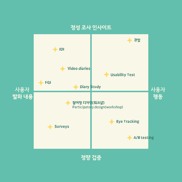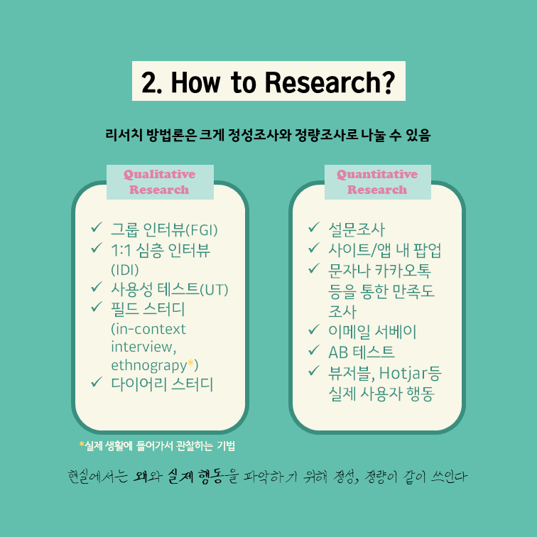 Field Study(Field Work) : 자원이 많이 투입되나 유저가 어떤 행동을 어떻게 하는지, 왜 하는지 정확히 알 수 있음. 유저의 니즈와 그들을 만족시킬 수 있는 기회를 파악할 수 있음.